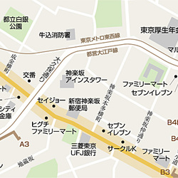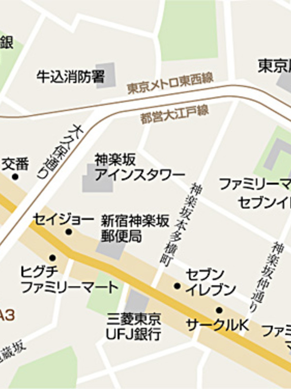 徒歩1分 東京メトロ東西線「神楽坂」駅 徒歩6分 JR中央・総武線「飯田橋」駅 徒歩8分 東京メトロ南北線「飯田橋」駅 徒歩8分 東京メトロ有楽町線「江戸川橋」駅 徒歩16分 |